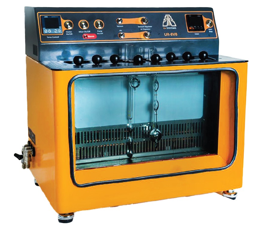 The UR-8VB Manual Viscosity Bath is a precision-engineered instrument for accurate determination of kinematic viscosity in accordance with ASTM D445, D446, D2170, D2171, and EN 12595 standards. Designed for reliability, visibility, and durability, the bath features a transparent glass chamber with a protective front window, allowing clear observation and safe operation. Capable of accommodating up to 8 viscometers simultaneously, the UR-8VB provides consistent and precise temperature control for light and heavy fuels, lubricating oils, and asphalts.