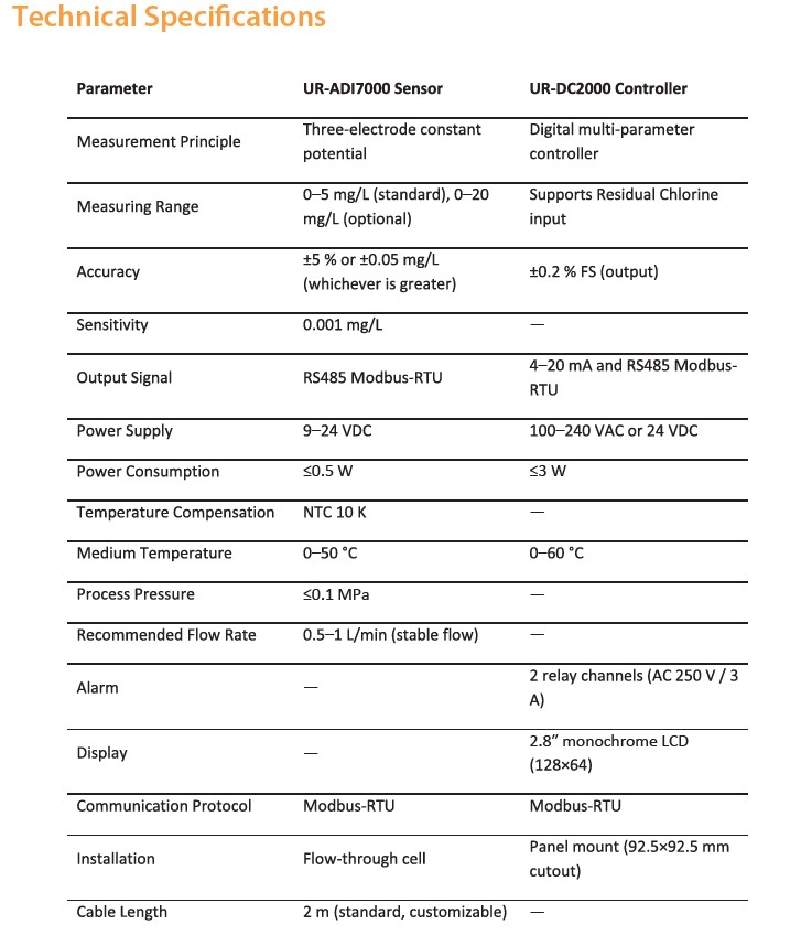 Series digital sensors, including Residual Chlorine, pH, ORP, Conductivity, Dissolved Oxygen, Turbidity, and Sludge Concentration probes. Engineered for performance and _exibility, the UR-DC2000 ensures accurate measurement, stable signal transmission, and easy communication with SCADA or other control systems. It is the ideal solution for water treatment, industrial process monitoring, and environmental analysis.